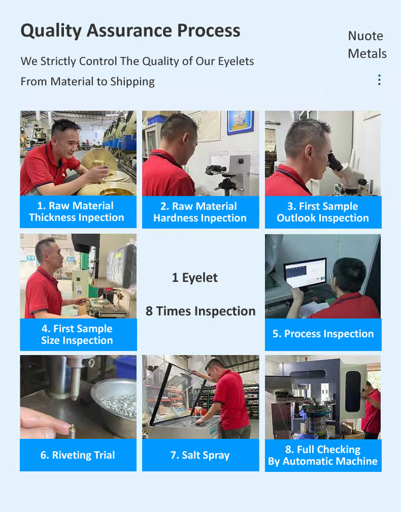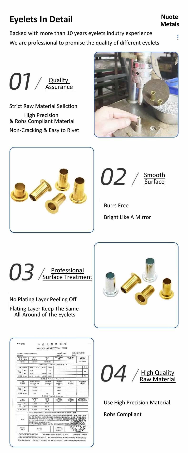 A: MOQ untuk eyelets ialah 50,000pcs, masa utama standard adalah kira-kira 10-15 hari bekerja, sila rujuk jualan untuk butiran.