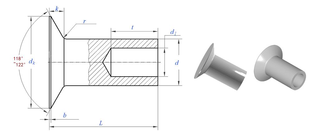 A Rivet separa T-Tubular countersunk kepala dipaparkan dengan mereka duduk siram dengan permukaan dan reka bentuk yang digerudi separuh jalan mereka.