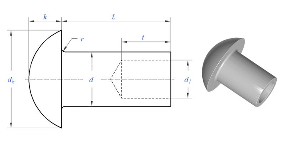 A rivet separuh tiub kepala cendawan Ciri -ciri kepala yang luas dan bulat yang menyediakan permukaan galas yang besar, mengedarkan beban dan mengurangkan ubah bentuk bahan.