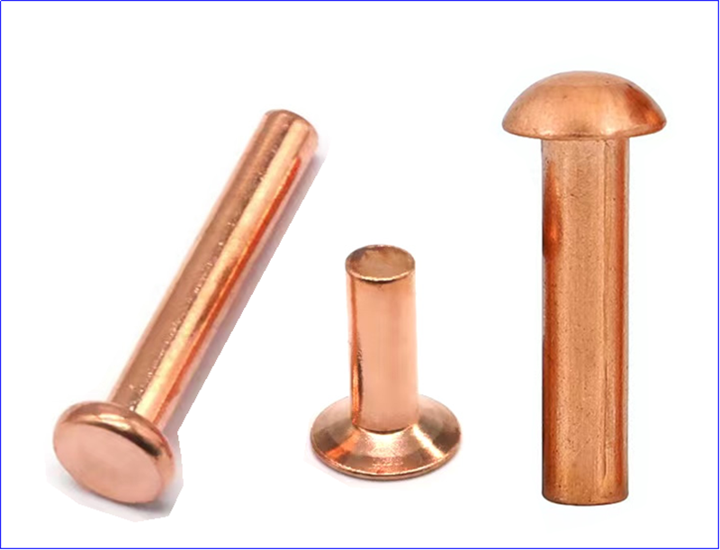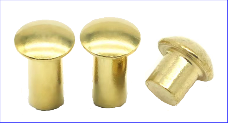 Tembaga:Rivet tembaga Menggabungkan kekonduksian elektrik dan ketahanan kakisan tembaga dengan penampilan yang menarik. Mereka sering digunakan dalam aplikasi hiasan seperti perhiasan, barang kulit, dan kerja logam hiasan.